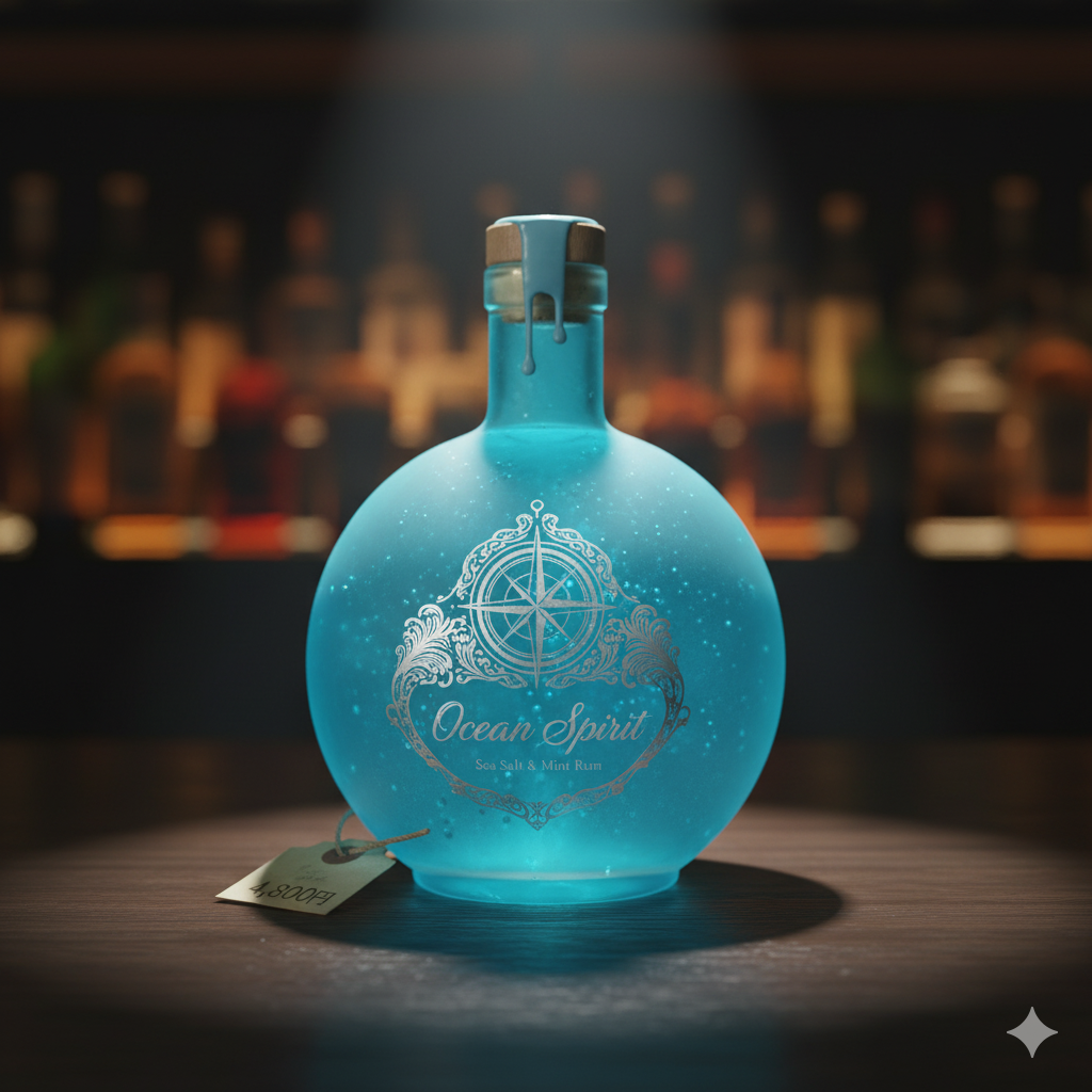 特徴: ターコイズブルーの丸いボトルが特徴的な、シーソルトとミント風味のラム。爽やかな味わい。